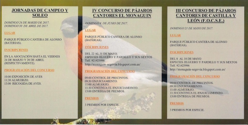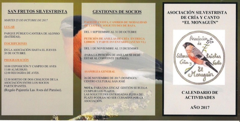 Calendario de actividades año 2.017 - Pajarería LAS AVES DEL PARAÍSO
